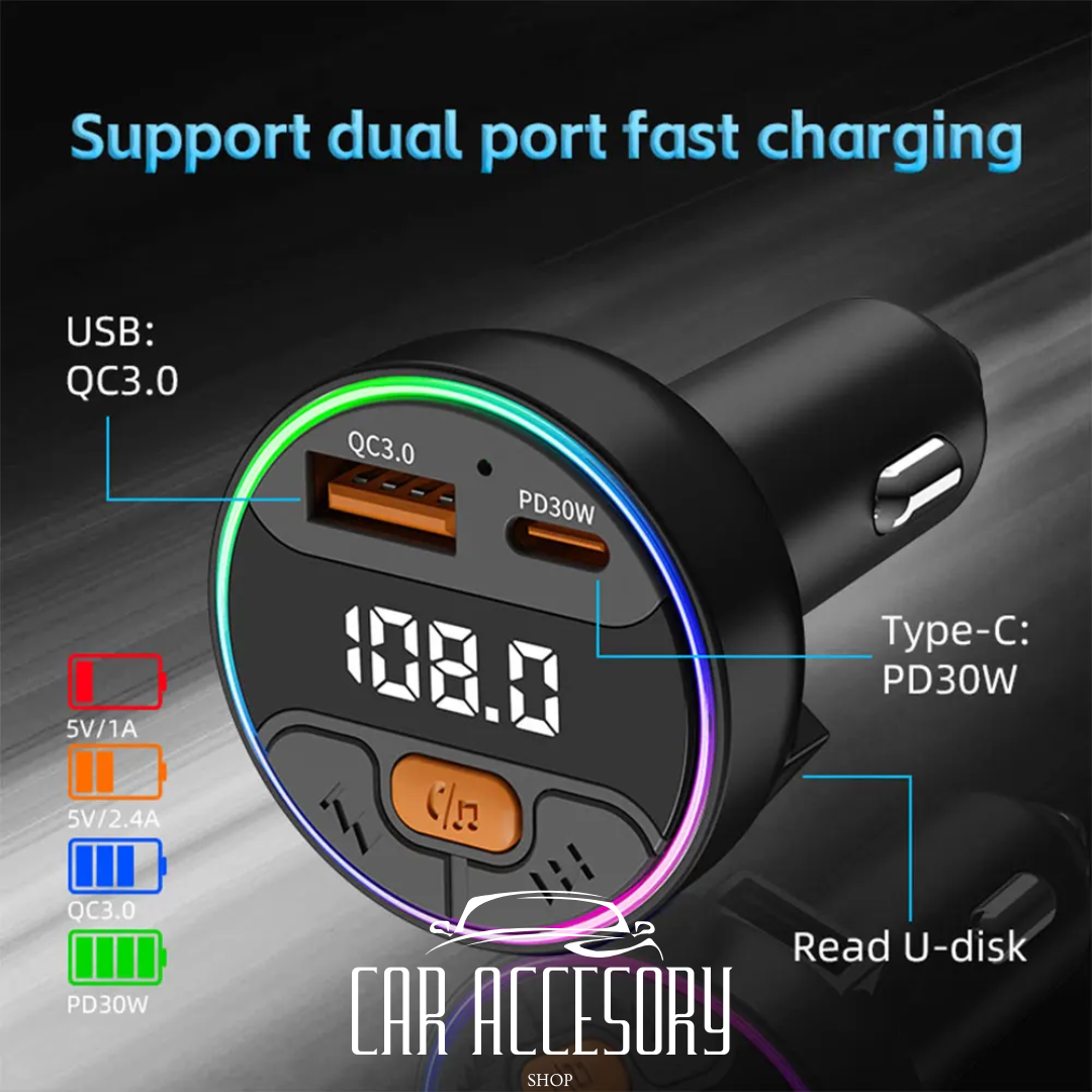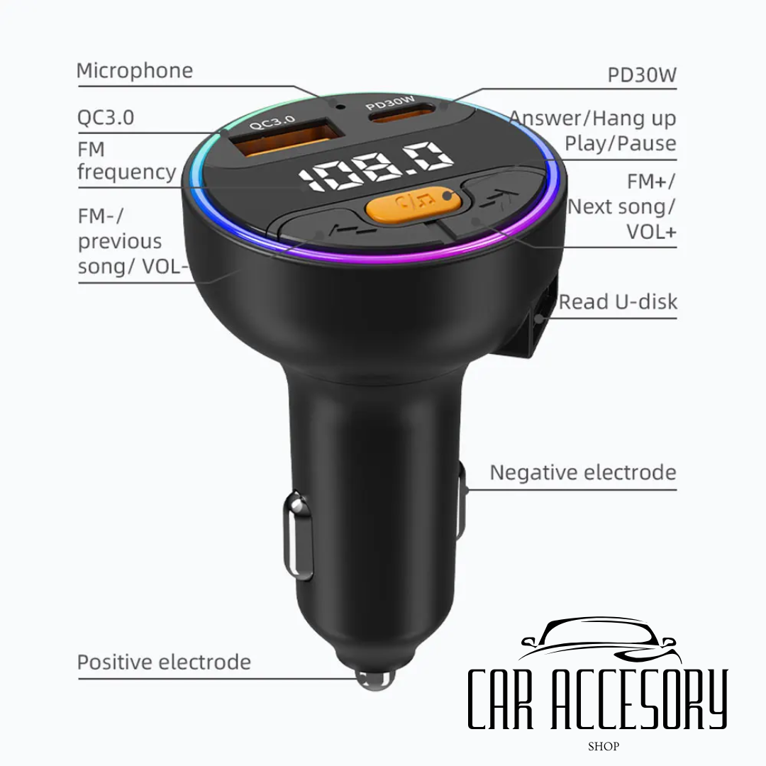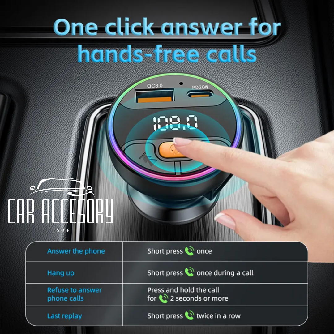 Enhance your driving experience with this comprehensive car accessory. Effortlessly stream music, handle calls hands-free, and simultaneously charge two devices using Bluetooth 5.3 for a fast and stable connection. Key features include clear audio and call quality with an integrated microphone, dual fast charging support (PD 30W and QC3.0), FM music playback through Bluetooth or USB, and intuitive one-touch controls for managing calls and music. Compatible with all vehicles equipped with a 12V or 24V cigarette lighter socket.